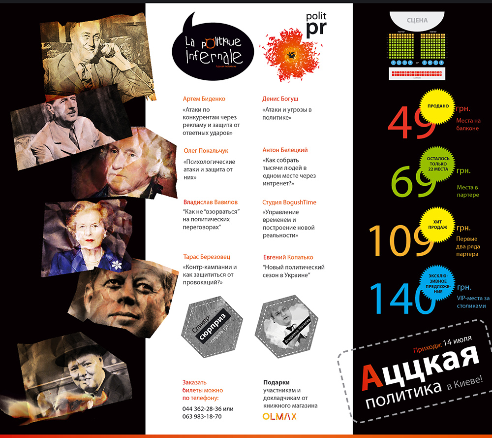 14 июля в Киеве состоится вечернее политическое шоу Адская политика. Шоу запланировано на 19.00 четверга в ресторан-клубе «Вкусная тема» на ул. Артема 37-41. Организаторами вечера выступила группа образовательных программ PolitPR Ukraine. Вход только по пригласительным.