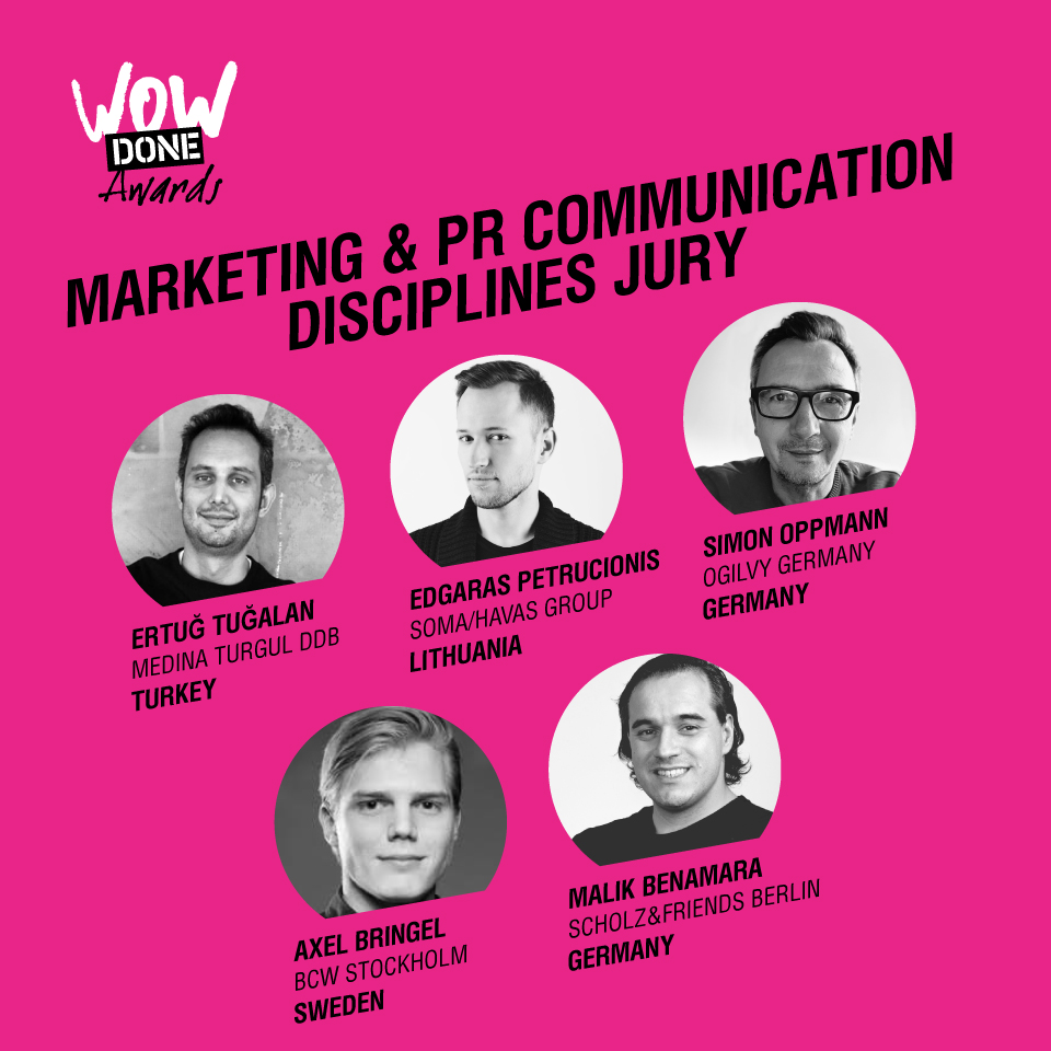 Для Marketing & PR Communication Disciplines організатори WOW DONE AWARDS зібрали лише майстрів своєї справи. Серед них ви зустрінете міжнародного руйнівника традиційних кордонів у digital та чотирьох креативних директорів, що з року в рік отримують золоті нагороди на міжнародних фестивалях та конкурсах. Вони, як професіонали, працювали з різними за профілем клієнтами: Mercedes-Benz, Huawei, SEB Bank, Telia, Jacobs (JDE), Red Bull, Neste Oil та багатьма іншими. Даний склад журі поповниться новими кандидатами.