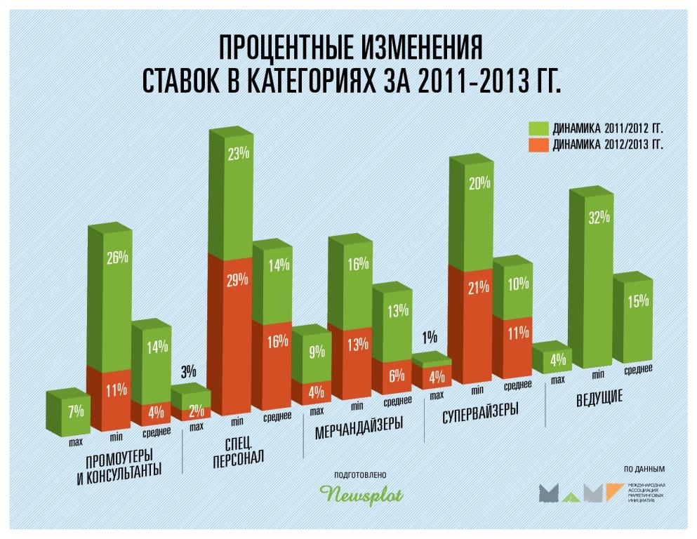 В целом, за прошедший год произошел существенный рост ставок оплаты промоперсонала всех категорий: динамика составила в среднем 10 - 15 %. Рост ставок в основном связан с инфляционными процессами и является техническим.