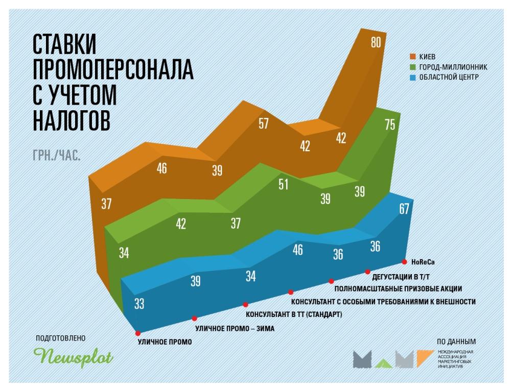 Исследования показали, что самые дорогие промоутеры, конечно, в столице. Так, уличный распространитель листовок получает 23 грн. в час, в миллионниках – на две гривны меньше, в областных центрах – 20 грн. Консультанты и промоутеры в торговых залах оплачиваются по 24- 26 грн. в Киеве, 23-24 для миллионников, и так же – 21-22 для областных центров. Персонал для работы в HoReCa стоит дороже: на руки киевляне получают 49 грн., жители областных центров – 41.  Приличные ставки у ребят модельной внешности или с особыми талантами: танцоры, аниматоры, ведущие шоу. Так, модели за час работы получают от 186 грн. в области до 251 в Киеве. Налоговые отчисления на вознаграждение персонала составляют до 60%.
