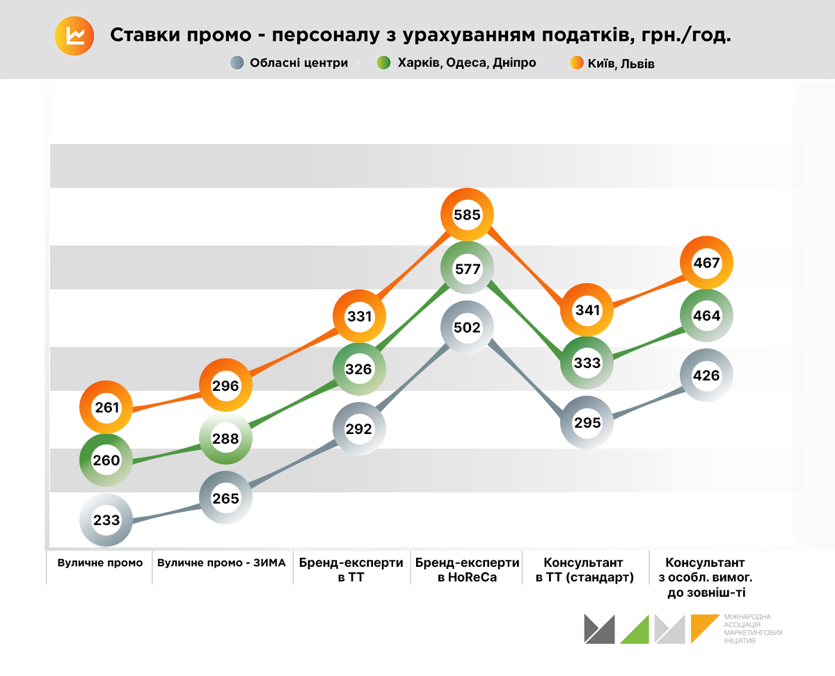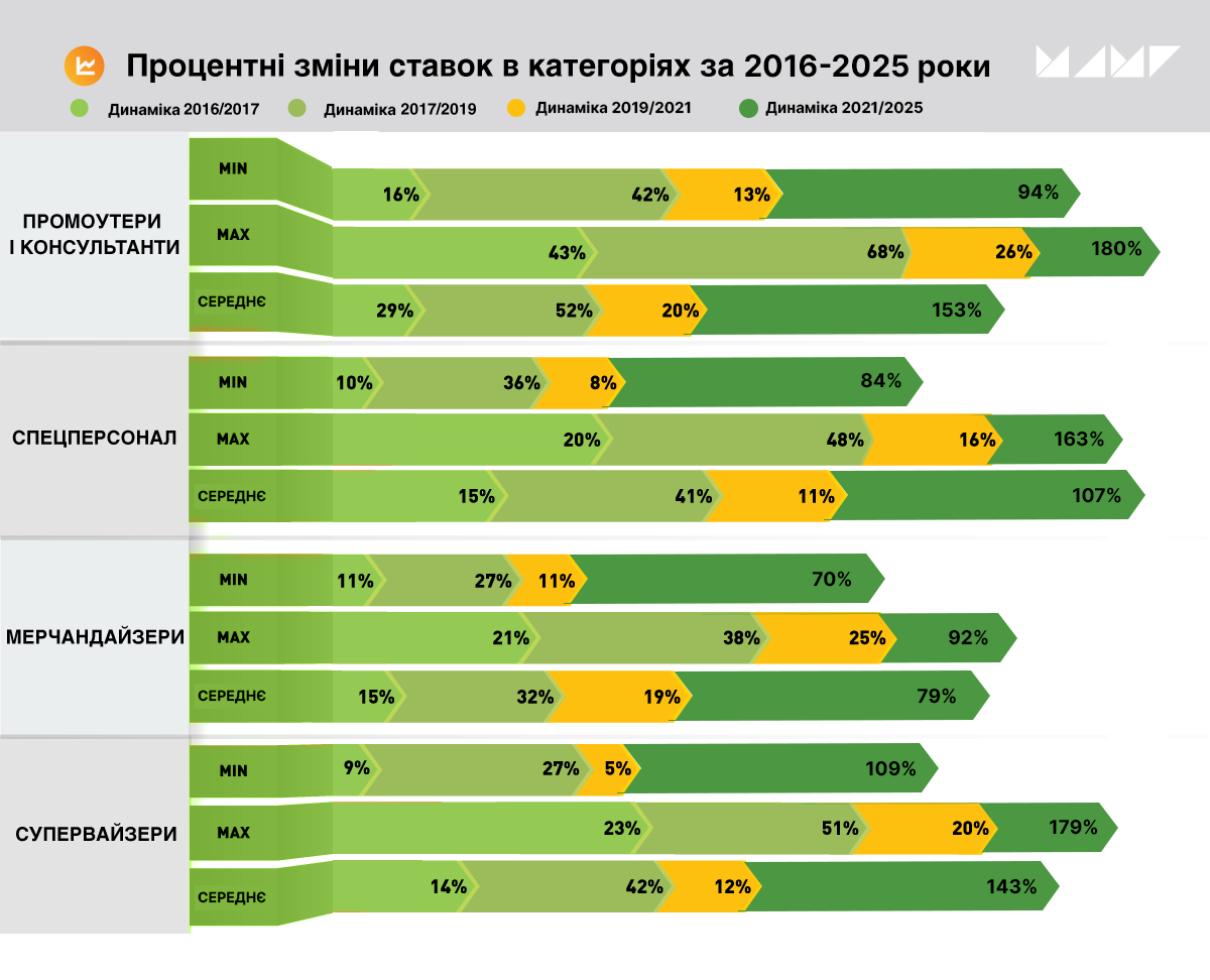 Загалом ставки промоутерів і консультантів зросли на 97–180%. Найменші зміни відбулися в оплаті консультантів кафе та ресторанів, а найбільші — у консультантів у магазинах. Як і раніше, коефіцієнт вищої оплати у святкові та вихідні дні становить 1,5–2.