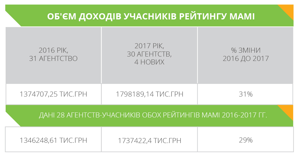 Обсяг ринку маркетингових послуг-2017 становить 1,8 млрд. грн., що порівняно з даними 2016 року + 31%, лише частково це можна пояснити інфляцією або новими учасниками рейтингу, оскільки досягнення 28 агентств-учасників обох рейтингів 2016 та 2017 року демонструють майже такий самий зріст + 29%. Ця динаміка прозоро ілюструє оцінки експертів: галузь нарешті «задихала», клієнти «прокинулись», активність зростає.