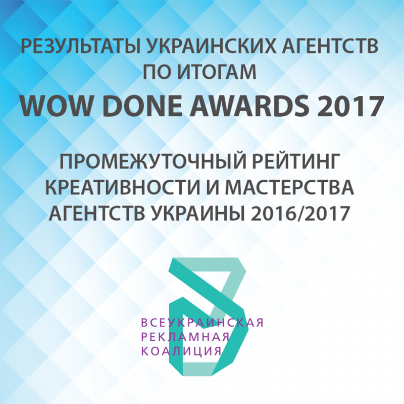 Лише 15 українських агентств отримали бали по результатам WOW DONE AWARDS 2017: ISD Group (63), Aimbulance (42), Saatchi & Saatchi (27), Adpro Ukraine (12), BBDO Ukraine (12), Postmen DA (12), Smartica/Skykillers (12), visageDDB (12), Havas Group Ukraine (6), PROVID (6), THINKMcCANN (6), ITCG (3), RAM360 (3), VANDOG AGENCY (3), Zenith (3).