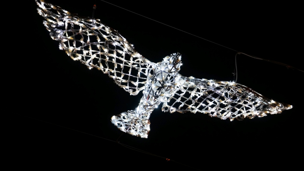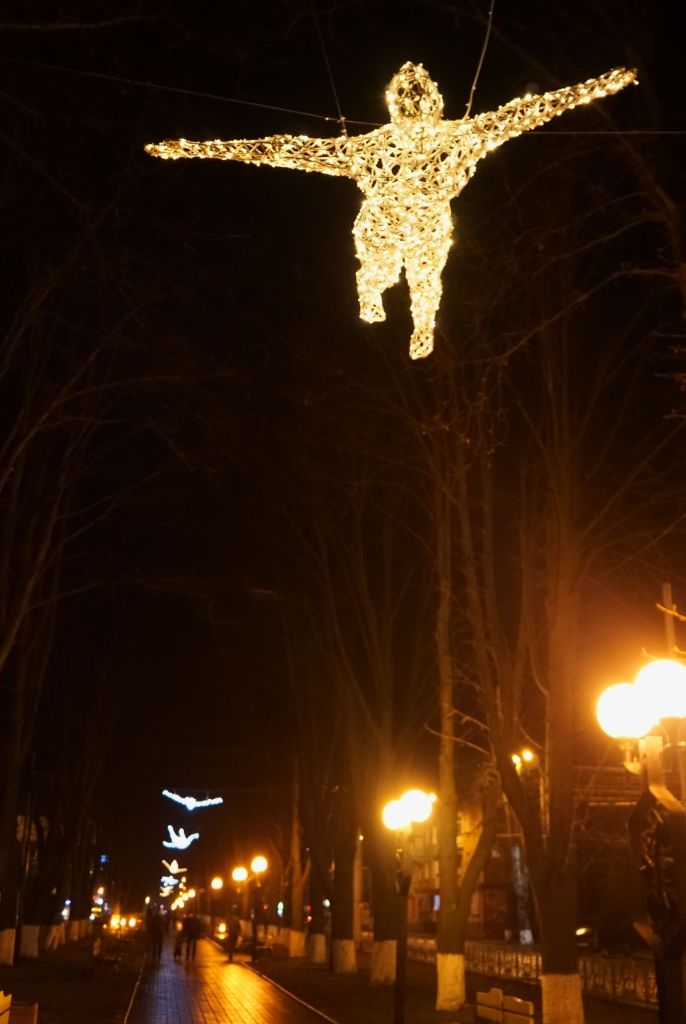 10 объемных фигур, 2 мотива: люди и птицы, словно парящие в воздухе. На мотив «Человек» ушло около 40 м гирлянды, 840 светодиодных ламп. Для мотива «Птица» понадобилось 60 м гирлянды, 600 светодиодных ламп. Фигуры людей подсвечиваются статично, а гирлянды всех 5 птиц мерцают и переливаются. Эффект рассчитан так, чтобы особенно классно фигуры смотрелись вблизи, когда проходишь под ними, ведь они смонтированы над бульварной зоной ул. Пирогова.