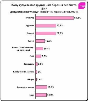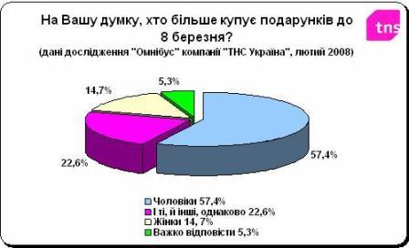 Напередодні 8 березня компанія «ТНС Україна» провела передсвяткове опитування в рамках щомісячного національного дослідження «Омнібус» (опитано 1200 респондентів з усієї України віком від 16 до 75 років з 6 по 13 лютого 2008 р). За результатами дослідження з’ясувалось, що більше подарунків на 8 березня купують чоловіки (так вважають 57,4% опитаних), 22,6% респондентів вважають, що на 8 березня і чоловіки, і жінки купують подарунків однаково, 14,7% впевнені, що більше подарунків купують жінки, 5,3% було важко відповісти.