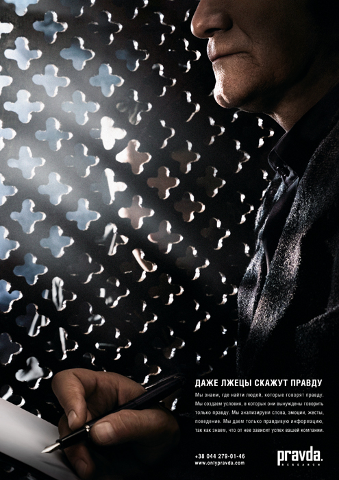 20 марта 2008 года в украинской деловой прессе вышла реклама, разработанная креативным бюро Sahar для PRAVDA Research. Сюжет принта наглядно демонстрирует, на что идет исследовательская компания ради правды из уст потребителей.