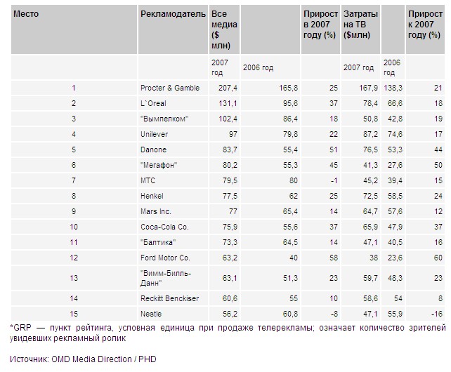 Группа медиаагентств OMD Media Direction/PHD подсчитала бюджеты крупнейших рекламодателей России в 2007 году и составила топ-15. Выяснилось, что у компаний расходы на рекламу росли заметно медленнее, чем обороты рекламного рынка — 25% против 37%. Одной из причин этого стало резкое сокращение объемов рекламы на ТВ: уменьшив объем закупок почти на 6% из-за роста цен, крупнейшие рекламодатели потратили на рекламу в федеральном эфире на 24% больше средств.