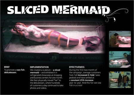 Егор Харьков, креативный директор РА «МЕХ»: «Мы создали скульптуру − нарезанную русалку и выставляли ее в морозильной витрине в торговых и бизнес-центрах на протяжении месяца. Затем, мы переместили ее в магазин морских деликатесов, где сотни покупателей ежедневно продолжали ее фотографировать и снимать на видео. Во время первых двух месяцев кампании среднее количество посетителей магазина удвоилось. Продажи достигли пика и остались на уровне плюс 25%. И это для морских деликатесов в период кризиса!»