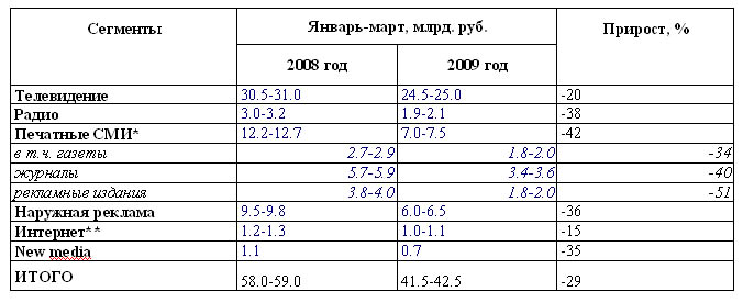 В среднем объемы российского рекламного рынка за прошедший квартал 2009 года сократились на 29%, что в принципе совпадает с прогнозом большинства "гуру" индустрии.