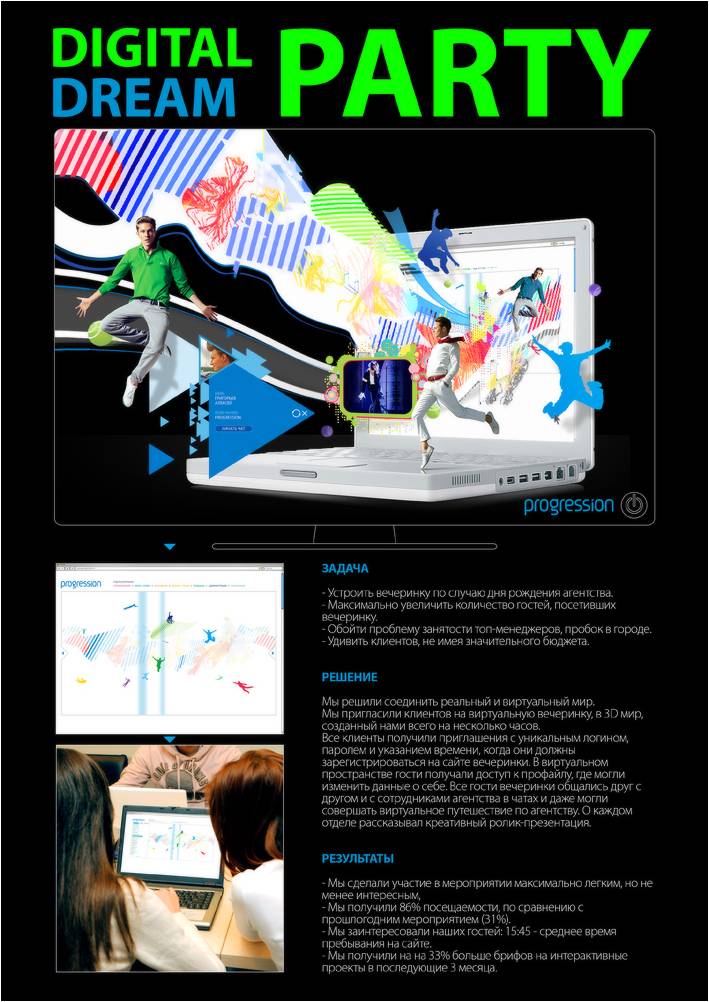 Два вторых места и одно – третье – завоевало агентство Progression, в номинациях: «Лучшая кампания b2b» - за проект «Он-лайн вечеринка Progression», «Лучший проект с использованием новых технологий» - за проект «Он-лайн вечеринка Progression» и «Лучшая социально-ориентированная кампания» - за проект «Агент Дорожной Безопасности Мишлен».