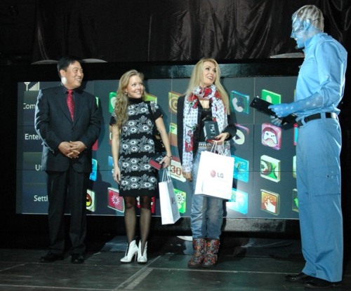 Когда корабль прибыл, гостей встретили представители народа На Ви – ведущий и хостесс с синим face артом, хвостами и голубыми одеяниями и мега-космический театр Квасса со своим футуристическим шоу. Затем искусство Пандоры - рисунки песком на стекле, и презентация лазерным шоу уникального элемента, за которым и отправились гости на Пандору, – нового телефона LG New Chocolate BL40.