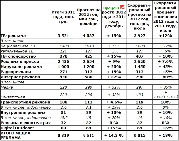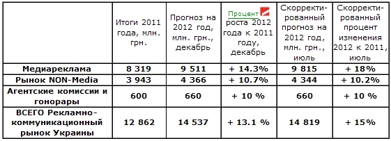 Итак, согласно июльским прогнозам экспертов ВРК рекламно-коммуникационный рынок Украины 2012 закончит с показателями в примерно 14 млрд 800 млн грн, что больше рынка прошлого года на 15%. Таким образом, прогнозируемый в декабре прошлого года рост рынка (13%) в целом подтверждается. Скажем спасибо наружной рекламе, интернету (особенно контексту) и надеждам на бурную политическую осень, которая принесет только деньги в рекламу и не привнесет никаких потрясений.