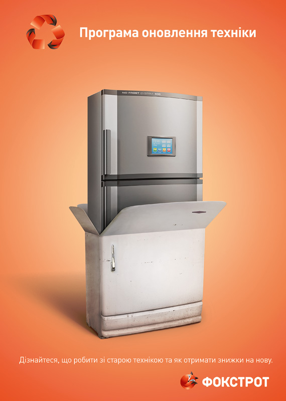 Креативное агентство «Мичурин» разработало имиджи для визуализации программы обновления техники в ТС «Фокстрот. Техника для дома». Суть программы состоит в том, что потребителям предоставляется возможность обменять свою старую (даже нерабочую) технику на новую со значительной скидкой.