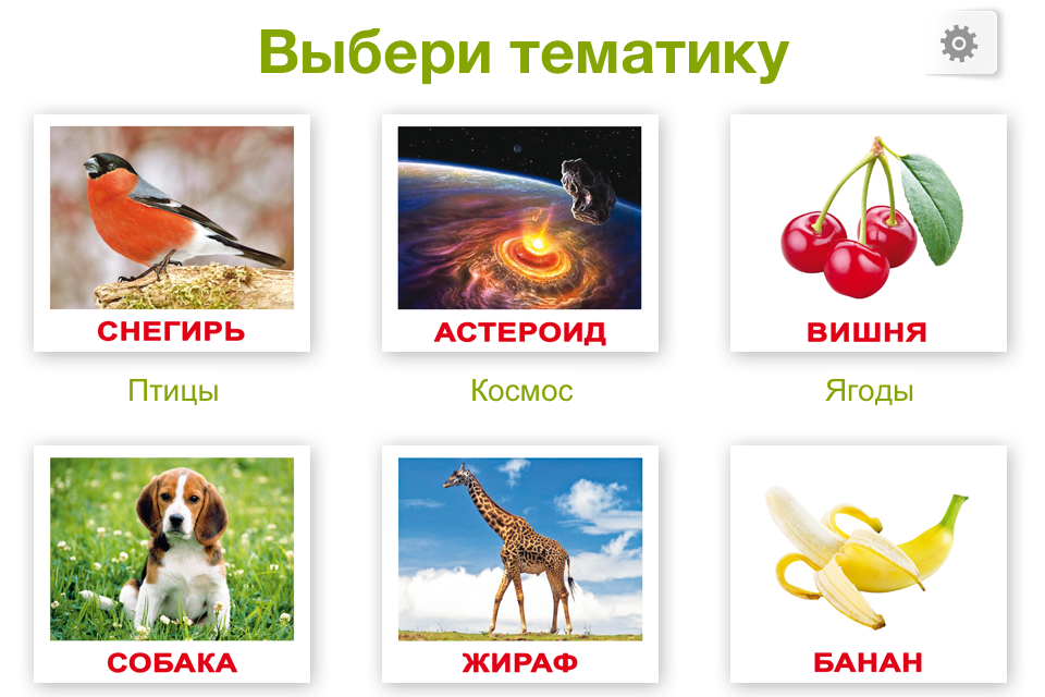 Приложение представляет собой серию из 20 тематических наборов карточек на самые разнообразные темы: птицы, животные, профессии, овощи, спорт, породы собак и многие другие. Каждая тема предлагает ребенку двадцать озвученных красочных карточек. Для совсем маленьких подойдет режим простого показа картинок. Детей постарше заинтересуют факты, которые сопровождают карточки. В завершение каждого показа вундеркиндам предлагается три увлекательных задания на определенную тему: «подбери картинку», «подбери подпись», «игра мемо».
