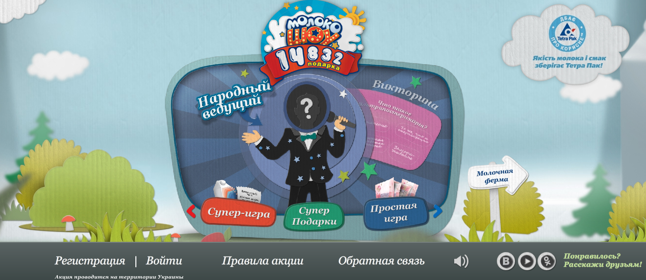 Чтобы наилучшим образом донести до людей информацию, Тетра Пак подготовил образовательную викторину, которая проводится на специализированном сайте. Ответив на пять вопросов, участники викторины открывают для себя достоверную информацию о молоке и получают поощрительные призы – пополнение счета мобильного телефона. А каждый из покупателей молока Тетра Пак в картонной упаковке может принять участие в Суперигре и получить более ценный подарок.