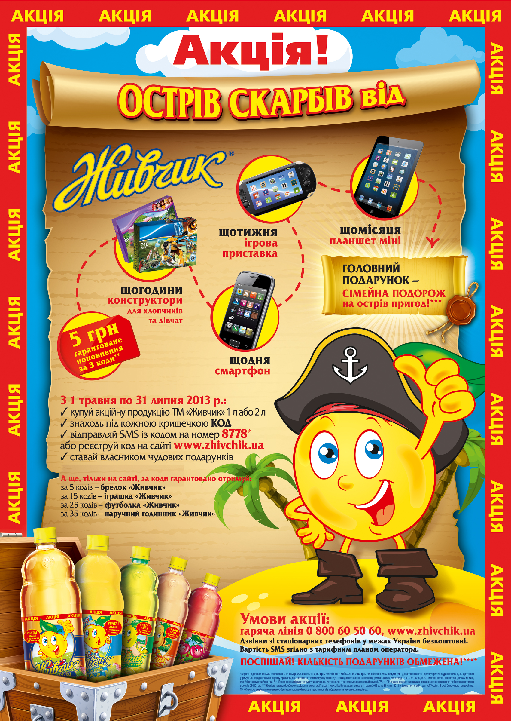 Живчик приглашает всех желающих присоединиться к акции "Остров сокровищ от Живчик". Условия акции очень просты: покупай акционную продукцию ТМ "Живчик" 1 или 2 л, находи под каждой крышкой восьмизначный код, активируй его с помощью sms на короткий номер 8778 или регистрируй на сайте