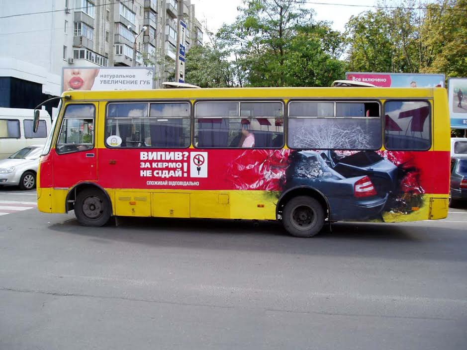 В городах-миллионниках на городском транспорте была размещена коммуникация «Випив? За кермо не сідай!» в виде последствий от столкновения автомобиля. Данный формат передачи сообщения используется уже второй год и является немного шоковым, благодаря чему имеет сильное влияние на аудиторию и работает как источник WOM..jpg)