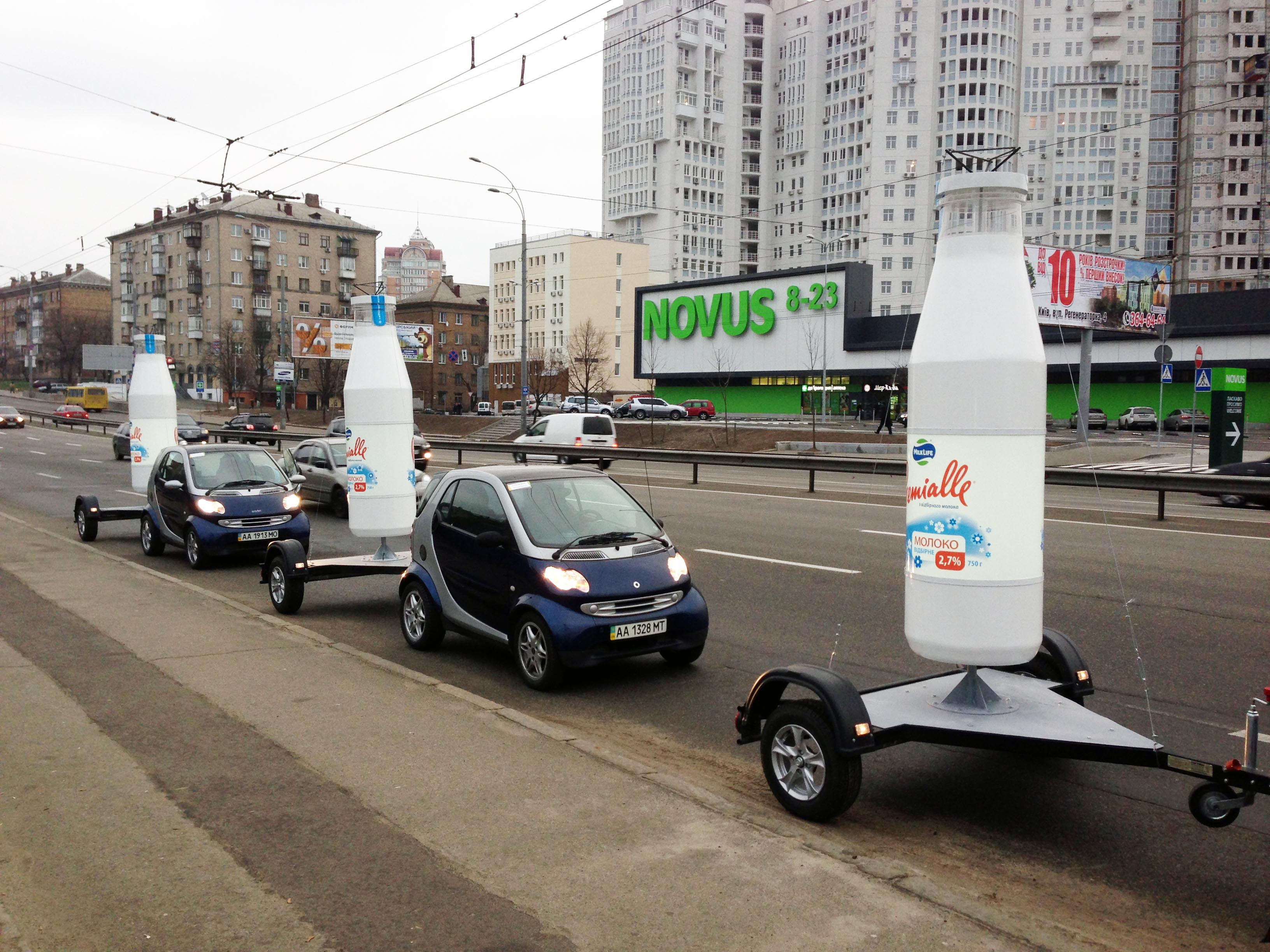Агентство нестандартных рекламных коммуникаций «Smile Smart» радо сообщить о запуске рекламной акции от ТМ Premialle. Бренд-мобили Smart с прицепами и макетами бутылок молока ТМ Premialle будет передвигаться по дорогам Киева до конца года. Желающие принять участие в акции смогут получить йогурты в подарок.