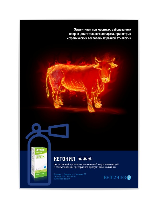 Создать запоминающийся принт позволила прямая ассоциация с жаром – главным симптомом заболевания, устранить который и призван препарат. Гиперболизированная идея нашла свое воплощение в принтах с «пылающей» коровой и «кипящей» свиньей. Сам «Кетонил» предстал в двух ипостасях – льда, охлаждающего кипящую воду (в постере со свиньей) и огнетушителя, гасящего пожар (в постере с коровой).