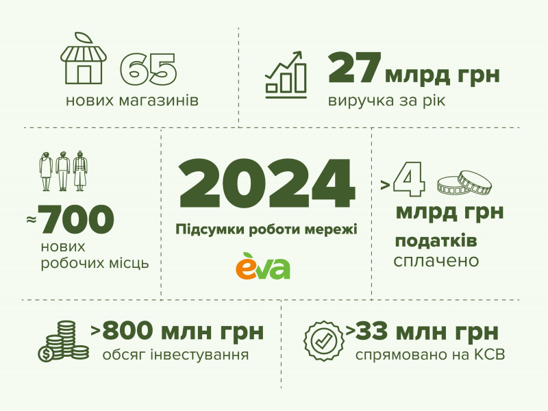 В кінці 2024 року (на 31.12.2024) компанія нараховувала 1109 працюючих магазинів (тоді як на 24 лютого 2022 року їх було 1116). За минулий рік відкрились 65 нових торгових точок. Переважно – у новому форматі EVA «Жіноча енергія» (45). Також після ребрендингу в нього переведені ще 26 магазинів, відкритих раніше. Таким чином на кінець 2024-го у форматі «Жіноча енергія» працював 121 магазин.