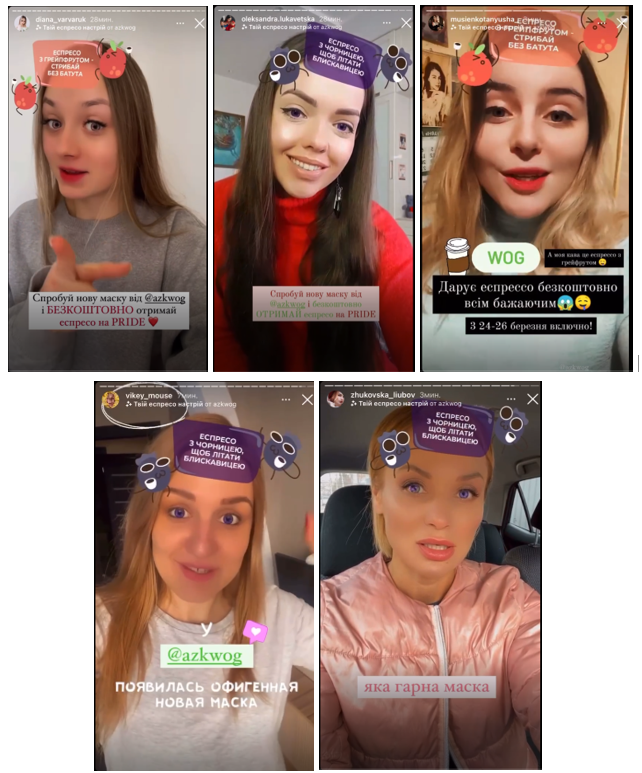 «Для анонсування еспресо масок ми взяли п’ять блогерів з аудиторією 100-150 тисяч підписників. Блогери обирались з прицілом на такі показники, як високе залучення і невисока щільність комерційних інтеграцій. Це відразу дало результат високого органічного охоплення — 312 тис показів, більше 3 тис. відкриттів та більше 2 тис. використань. Процес — від створення масок до апруву та запуску у Instagram — зайняв два тижні. Така швидкість можлива, якщо підрядник отримує максимально точне ТЗ, тобто клієнт і агенція працюють із розумінням цілі і повним баченням кампанії», — коментує співзасновніця агенції Trembita PR Дар’я Сухенко.