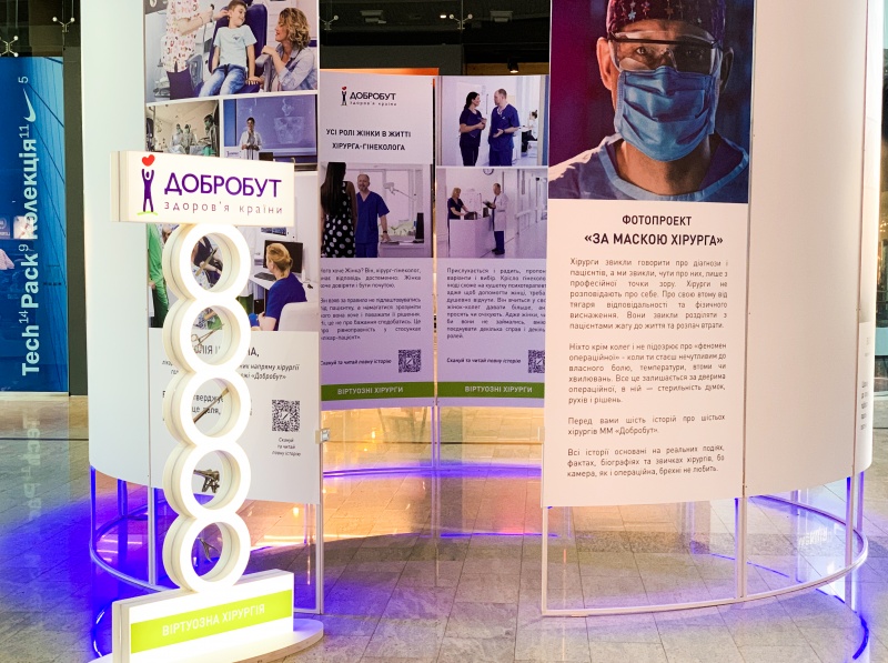 Фотовыставка – это нестандартная большая конструкция, выполненная в форме лабиринта, куда человек мог зайти и познакомиться с историями врачей как с больших фотополотен, так и с помощью QR-кодов, в которых зашифрована вся информация о проекте. Чтобы сразу зацепить людей и привлечь внимание к экспозиции, заманчиво разместили у входа в фотозону стеллу с хирургическими принадлежностями и привлекли к проекту топовых украинских блогеров Софию Стужук, Татьяну Пренткович, Татьяну Парфильеву и других. Разумеется, важным фактором было совпадение целевой аудитории блогеров с целевой аудиторией МС «Добробут». Общее количество просмотров постов и сторис о выставке у лидеров мнений составило 2 545 332! Усилили информационную волну с помощью анонсов проекта в СМИ, которые дали охват 47 803 человек и обеспечили дополнительное попадание в поле зрения аудитории.
