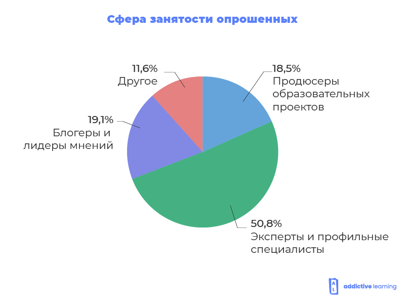 Основную часть онлайн-курсов создают эксперты и профильные специалисты – до 50,8% от всех курсов в интернете созданы именно такими людьми. Еще 19,1% курсов создают контент-мейкеры – блогеры и лидеры мнений. Именно эти две группы авторов, по данным Addictive Learning, больше ориентированы на передачу знаний. У этих двух категорий стремление обучать превалирует над целью заработать.