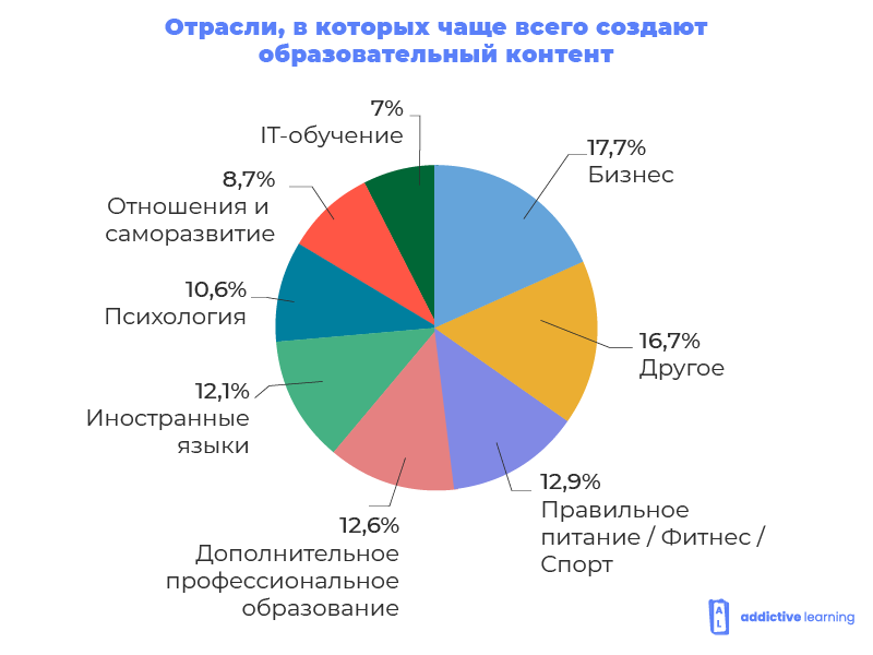 Больше всего запускают курсы по бизнес обучению (17,7%). На втором месте - образовательные проекты в сфере «Правильное питание и фитнес» (12,9%). Около 13% резидентов Addictive Learning обучают нишевым специальностям. Это маркетинг, копирайтинг и другие сферы дополнительного образования. 12% онлайн-образователей обучают иностранным языкам. На пятом месте по популярности – курсы по психологии и коучингу, составляющие суммарно около 10,6% рынка.