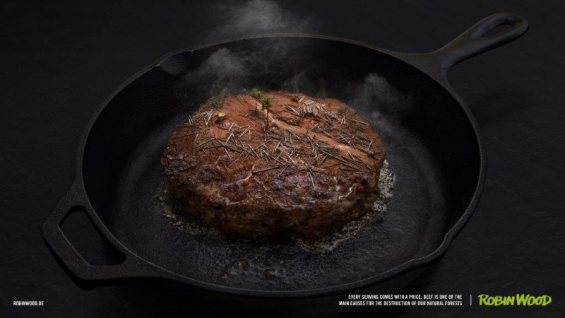 С ключевым сообщением «Каждая порция имеет свою цену» ("Every Serving Comes With a Price"), кампания для немецкой экологической неправительственной организации ROBIN WOOD иллюстрирует огромный ущерб, нанесенный природе в результате вырубки лесов для разведения крупного рогатого скота.