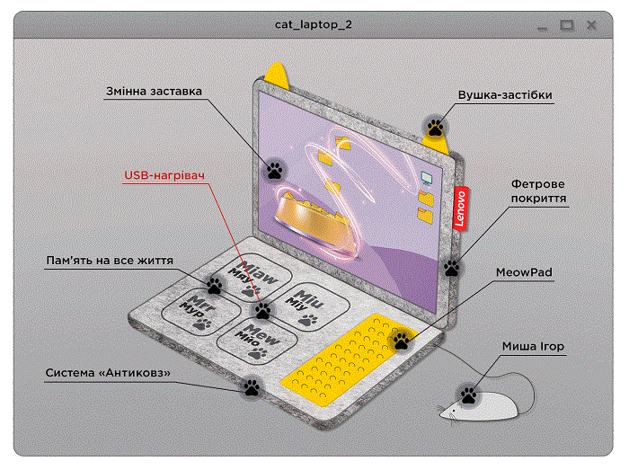 «Цінності бренду Lenovo – інновації, амбіції і результативність. А ще увага до потреб наших користувачів. Зараз людям потрібно більше теплих і позитивних емоцій. Як і будь-який наш продукт, MeowBook є стильним, сучасним і ефективним тулом для користувача. Це розумні технології для кожного,» – ділиться Марина Дорошенко, фахівчиня з маркетингу компанії Lenovo в Україні.