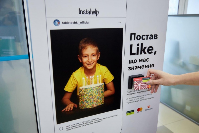 Благодійний фонд “Таблеточки” та Leo Burnett Ukraine в партнерстві з “Ощадбанком” та “Mastercard” зробили цю просту думку реальністю. Будь-який відвідувач відділення банку може лайкнути пост про Івана Сініцина, котрий переміг рак ще 2015 року, за допомогою своєї банківської картки. Під сердечком розташований термінал безконтактної оплати, який перетворює дотик на 50 гривень і надсилає їх до фонду. Так й інші хворі діти отримують шанс колись написати в соціальних профілях: “Я зміг, я переміг рак!”