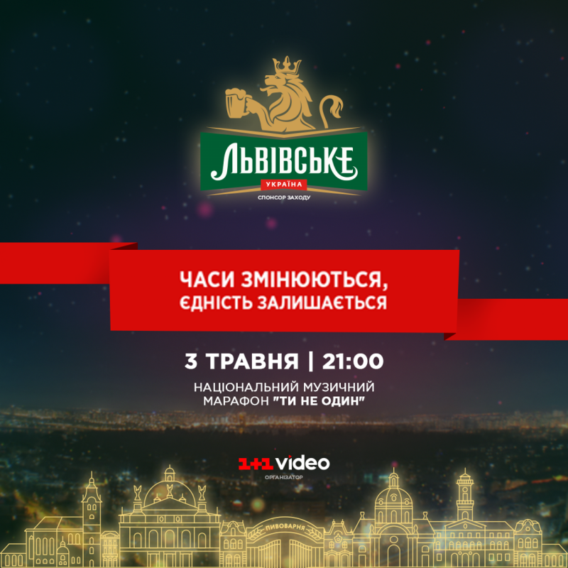 3-го мая при поддержке ТМ «Львівське» на телеканале 1+1 суперзвезды украинского шоу-биза будут петь ради жизни. Целью национального музыкального марафона «Ти не один» есть сбор денег на средства индивидуальной защиты для врачей.