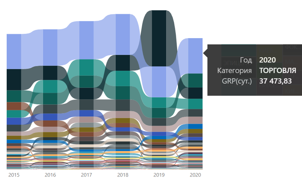 Динамика проданных GRP по категориям, 2015-2020 (по февраль включительно)