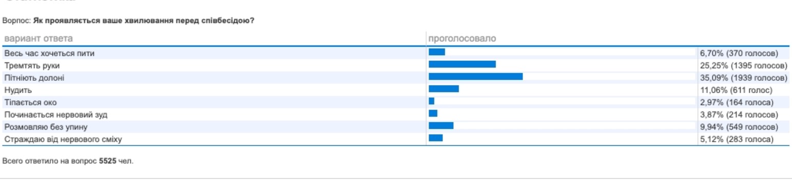 У рамках проекту «Візьми Моршинську на роботу», Work.ua провели дослідження серед 5,5 тисяч респондентів про те, як проявляється їх хвилювання перед співбесідою: 35% респондентів позначили, що у них пітніють долоні, 25% зізналися, що стикаються із тремтінням рук, 11% страждають від нудоти, 10% розмовляють без упину, а 7% респондентів постійно хочуть пити. Серед інших проявів хвилювання було позначено тіпання ока, нервовий сміх та свербіж тіла.