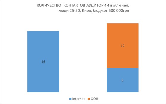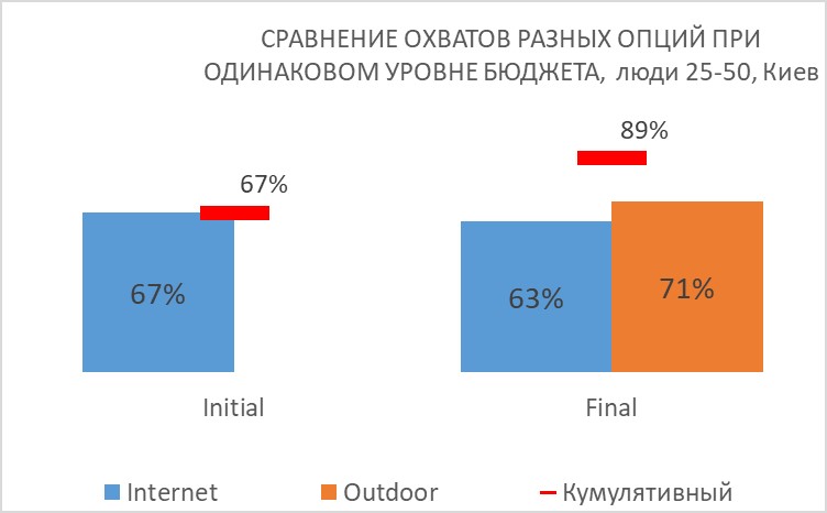 Мы также рекомендовали клиенту рассмотреть вторую опцию построения охвата в городе Киев, где часть планового бюджета выделялось на наружную рекламу. Для эффективной работы двух медиа в синергии необходимо, чтобы сообщение было одинаково заметным для аудитории, как в интернете, так и в наружной рекламе. Понимая это, мы на основе анализа данных предложили вариант, в котором при фиксированном бюджете 500 000 грн. можно было получить максимально возможный охват. Мы распределили бюджет таким образом, чтобы достигнуть массового охвата, как в первом, так и во втором медиа, при этом сделать доли этих медиа таковыми, чтобы результирующий охват был максимальным.