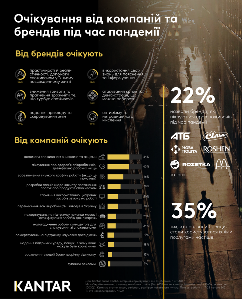 26% респондентів очікують, що бренди будуть використовувати свої знання для пояснення та інформування, 24% – що вони атакуватимуть кризу та демонструватимуть, як її можна побороти, 22% хочуть бачити бренди оптимістами з нетрадиційним мисленням.