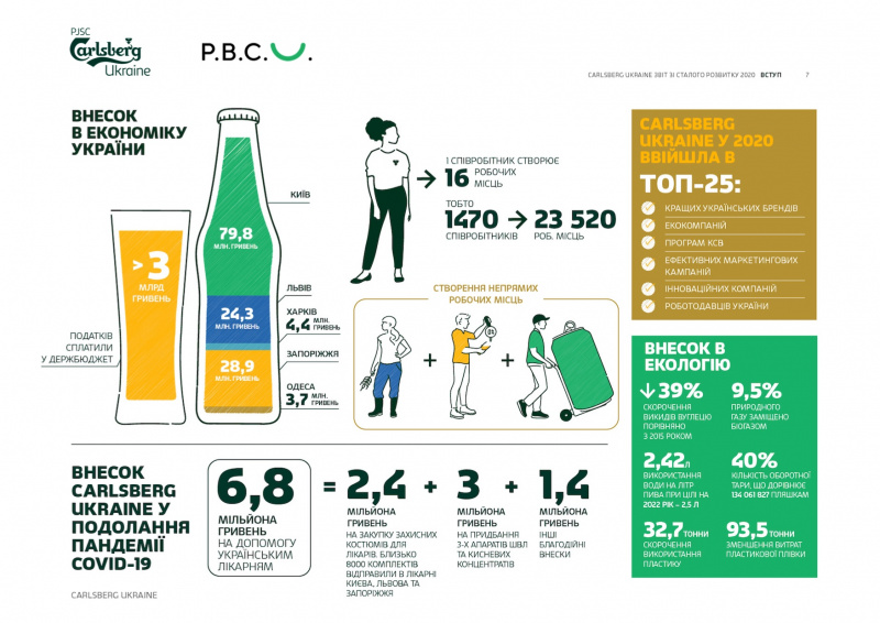 «Carlsberg Ukraine виробляє один із видів біопалива – біогаз. У 2020 році ним було заміщено 9,5% природного газу. Компанія також використовує оборотну скляну тару як найбільш дружній вид паковання. У 2020 році ми зібрали 40% пляшок, а це більш як 134 мільйони. Нам вдалося зменшити використання пластику та плівки в упаковці на 126 тисяч тонн. Заводи Carlsberg в Україні – одні з найефективніших з використання води в Carlsberg Group. Станом на 2020 рік Carlsberg Ukraine використовує 2,42 гл/гл для виготовлення пива, що випереджає ціль до 2022 року – використовувати 2,5 гл/гл. Крім цього, ми прагнемо уникнути випадків безвідповідального споживання. А тому даємо споживачам альтернативу – безалкогольну продукцію та підтримуємо інформаційні кампанії щодо відповідального споживання», – розповіла про результати Юлія Стельмах, старша директорка по роботі з органами державної влади та з корпоративних питань Carlsberg Ukraine.