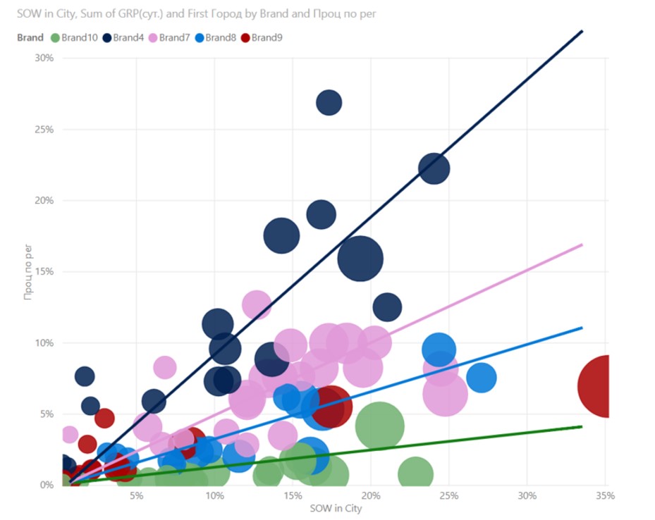 На графике очевидна корреляция между затратами и полученным эффектом. Указанный бренд успешно использовал региональное воздействие на аудиторию, что отобразилось в проценте полученной региональной «прибыли».
