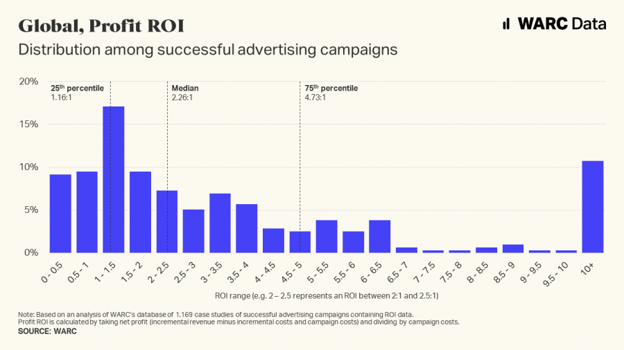 Успішні рекламодавці досягають середнього показника рентабельності інвестицій (ROI) 2.26:1, про що свідчить аналіз бази даних WARC, що містить 1169 прикладів вдалих рекламних кампаній.