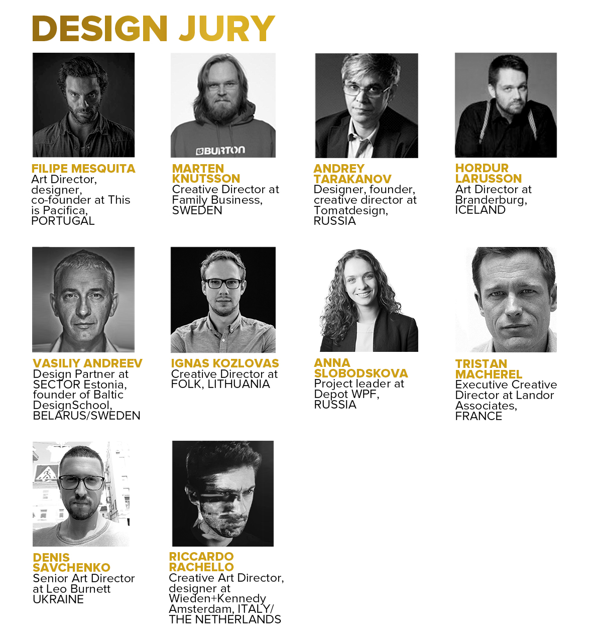 Этот состав жюри будет оценивать работы, участвующие в конкурсах графического и коммуникационного дизайна, этикетки/упаковки, наружной рекламы.