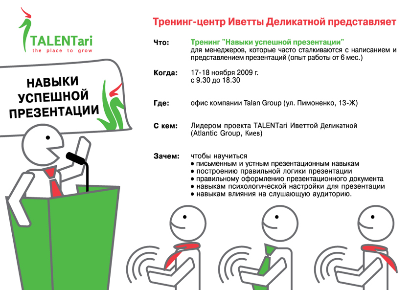 17-18 ноября 2009 г. тренинг-центр Иветты Деликатной представляет открытый тренинг "Навыки успешной презентации".