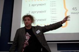 Первый доклад «Смерть от PowerPoint» Андрей Хохолкин начал с эксперимента. Выступление о нескучных презентациях он провел… под слайды чужой презентации! На ее примере Андрей показал основные ошибки выступающих, и дал 4 рекомендации, как «не умереть от PowerPoint и не довести до смерти клиента». Понимая, какие задачи решает ваша презентация, вы сможете подобрать ту ее структуру, которая сработает на вашу  идею. Господин Хохолкин подчеркнул, что проект должен быть легко масштабируем: построив первые 2-3 слайда по принципу «Задача – катастрофа, решение – бомба, результат – улет», вы мотивируете слушателя заглянуть в остальные 97 слайдов.