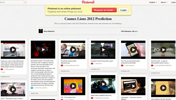 Социальная сеть Pinterest известна своей популярностью у женщин: здесь можно выкладывать приготовление еды в картинках и наглядно представлять другие увлечения и хобби. Нарушив традицию, сотрудник одного рекламного агентства «в картинках» представил возможных победителей фестиваля рекламы «Каннские Львы-2012». Напомним, фестиваль пройдет 17-23 июня.