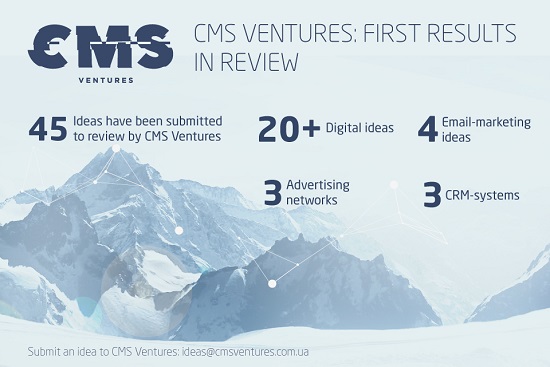 45 – такое количество идей и потенциальных проектов для инвестирования были поданы на рассмотрение в CMS Ventures за 1 месяц. Из них: 20+ диджитал-решений, 4 проекта email-маркетинга, 3 идеи создания новых рекламных сетей, 3 предложения по разработке и запуску CRM-систем.