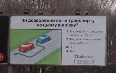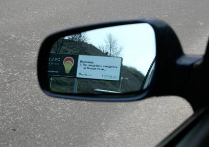 На аварийно-опасном участке дороги в Киеве, по улице Январского Восстания в марте-апреле 2009 г. был размещен бигборд-билет, который в точности моделировал дорожную ситуацию в месте размещения. Правильный ответ можно было легко прочесть в зеркале заднего вида.
