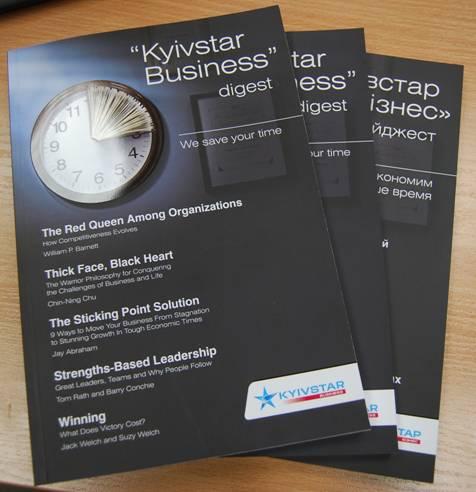 Обзор бизнес литературы – новый проект компании «Киевстар». Его цель – помочь абонентам «Киевстар Бизнес» узнать о лучших литературных новинках, которые могут пригодиться руководителям и менеджерам компаний в ведении бизнеса. Обзор бизнес- литературы проводится профессионалами в области управления предприятием и содержит оценку практического применения материала. Таким образом, управленцы продолжают оставаться в курсе всех современных методик управления бизнесом, при этом экономя свое время. Обзор подается в 3-х форматах – в электронном, в печатном виде, а также аудиозапись.