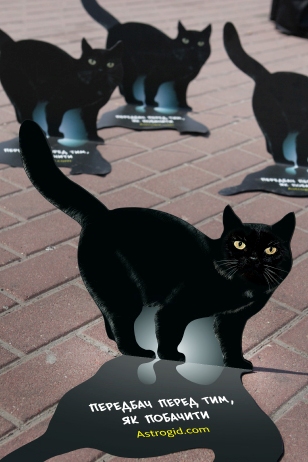 Напомним, что 24 апреля 2009 года киевских прохожих шокировали черные коты, в разгар утреннего часа пик разместившиеся на тротуарах города. Только подойдя вплотную к животному, можно было заметить, что это не настоящий кот, а оригинальная фигурка. В течение дня был организован и PR-ивент к флешмоберам присоединились журналисты и фото-репортеры развлекательных СМИ и представители украинского шоу-бизнеса – «фабрикантка» Аня Мухина, певец Влад Цветаев, MC Тамерлан и участники группы Chicos De La Fiesta.