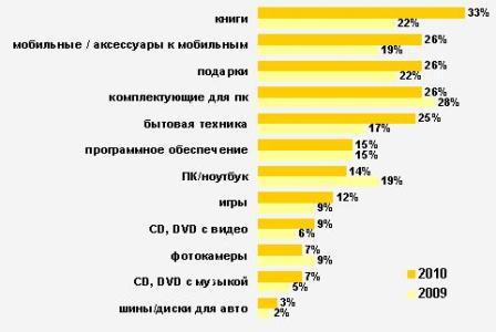 Основные категории товаров, приобретаемые через интернет, по итогам опроса интернет пользователей, - это книги, которые стало приобретать существенно большее количество пользователей по сравнению с прошлым годом. Также выросло количество онлайн покупателей мобильных телефонов и аксессуаров к ним. Среди других популярных категорий, приобретаемых онлайн, комплектующие для ПК, бытовая техника. Четверть всех покупателей используют онлайн магазины для приобретения подарков.