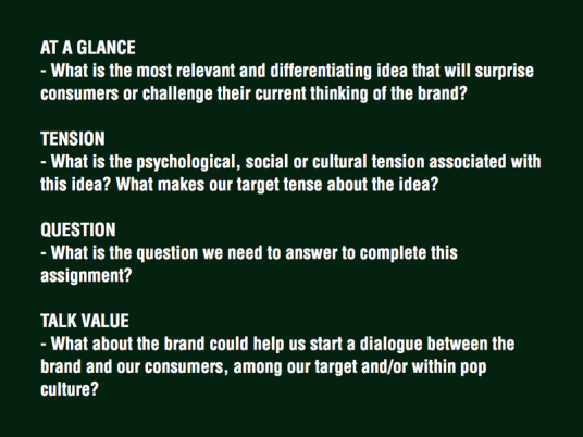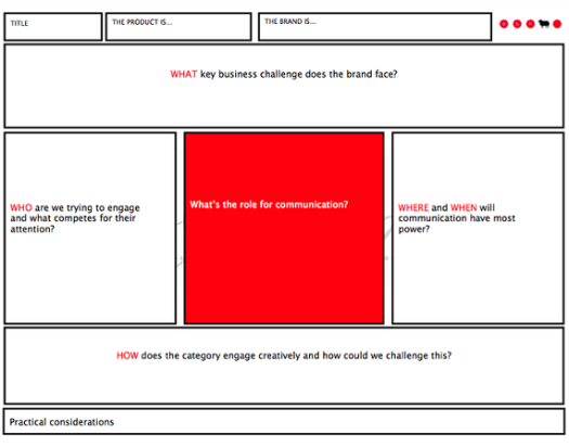 В центре внимания брифа BBH — роль коммуникации, что предполагает акцент на поиске решения актуальной проблемы. Вокруг — вопросы что, кто, когда, где и как. Этот бриф предполагает поиск комплексных решений, но выглядит не слишком вдохновляюще и просто.