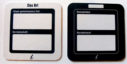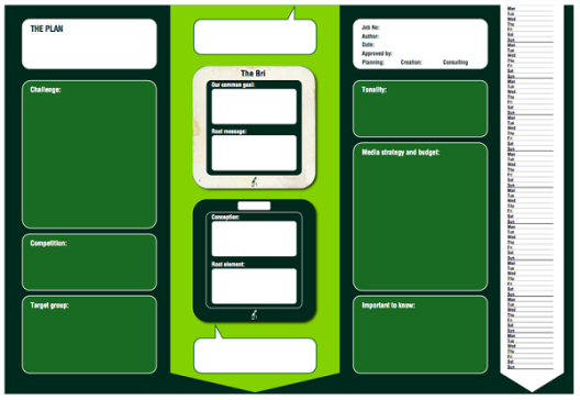 Шаблон брифа немецкой сети Jung von Matt зеленый, имеет четкую и простую структуру, понятную с первого взгляда. Блоки в середине сделаны в форме подставки под пивной бокал, просто потому что под пиво вечером легко думается, а эти подставки люди очень любят задумчиво крутить в руках. Кроме бумажного брифа, в агентстве действительно существуют такие подставки под пивные бокалы.